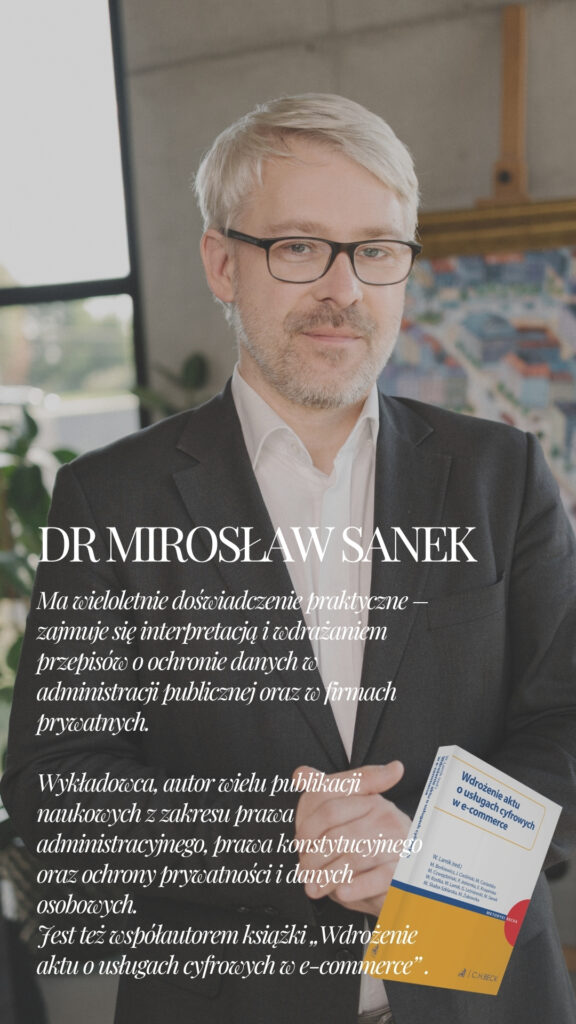 Dr Mirosław Sanek to były Zastępca Prezesa Urzędu Ochrony Danych Osobowych, odpowiedzialny za nadzór nad postępowaniami administracyjnymi i interpretacjami przepisów. Jego doświadczenie obejmuje zarówno sektor publiczny, jak i najważniejsze przedsiębiorstwa w kraju. Jest współautorem wydanej przez C.H. Beck publikacji „Wdrożenie aktu o usługach cyfrowych w e-commerce” i uznanym specjalistą w obszarze compliance oraz transformacji cyfrowej.