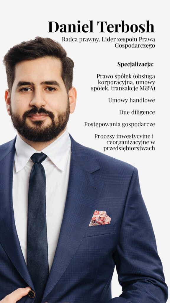 Na czele Działu Gospodarczego stoi r.pr. Daniel Terbosh, radca prawny, który od lat wspiera przedsiębiorców w procesach reorganizacji, przekształceń oraz w bieżącej obsłudze korporacyjnej. Zespół działa w ścisłej współpracy z Wspólniczką Zarządzającą MKZPartnerzy – Katarzyna Kosicka-Polak, zapewniając Klientom holistyczne podejście do projektów gospodarczych, obejmujące zarówno aspekt prawny, jak i strategiczny.