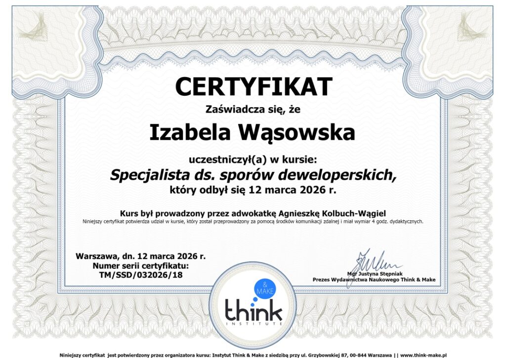 W marcu Wspólnik MKZPartnerzy, radca prawny Izabela Wąsowska oraz adwokat Justyna Emrich z Działu Nieruchomości MKZPartnerzy uzyskały certyfikaty ukończenia specjalistycznego kursu „Prawnik ds. sporów deweloperskich”.